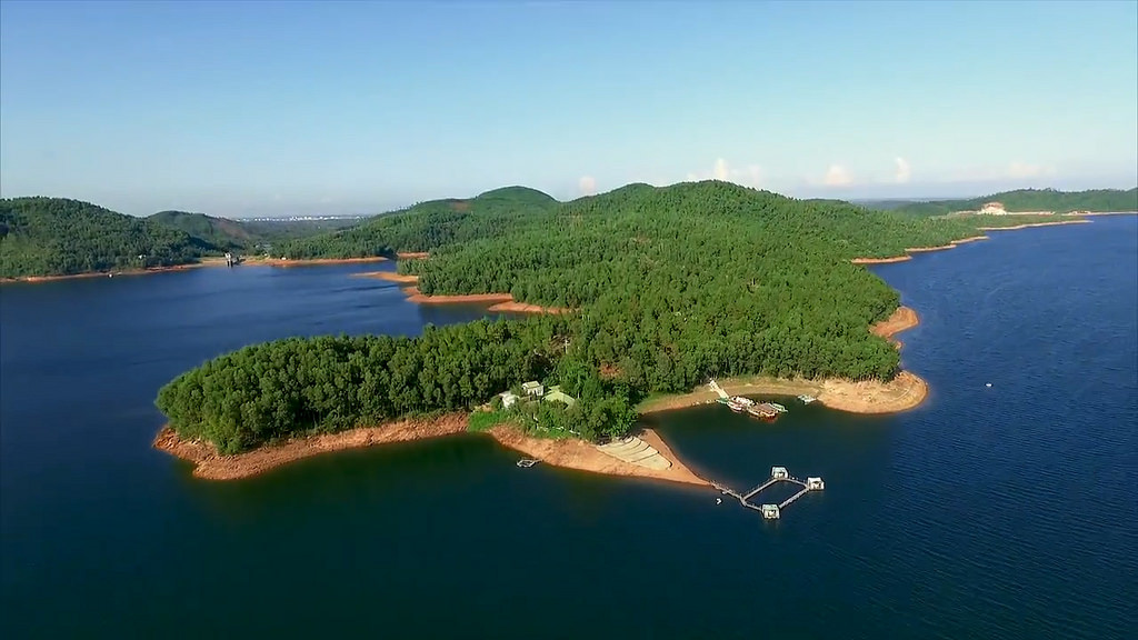 Hồ được bao quanh bởi những đảo nổi. Mặt hồ như tấm gương phẳng lặng, màu nước phản chiếu màu trời nên xanh trong quanh năm, được núi non bao bọc ôm ấp, hòa quyện cùng sắc xanh tươi của rừng cây, đồng cỏ xung quanh, tạo thành một bức tranh thiên nhiên tươi mát. Những đảo nổi nhân tạo nhô lên như nét chấm điểm tô thêm vẻ đẹp cho hồ. Làn nước lăn tăn trước cơn gió nhẹ hay in bóng mây trời rực rỡ trong nắng vàng càng làm khung cảnh thêm phần thơ mộng.